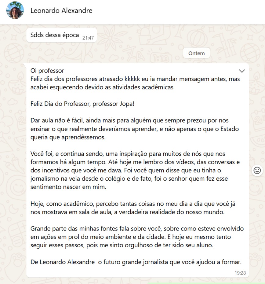 “Se a vida boa, a vida classe A, a vida digna é dedicada ao outro. Se o grande barato da vida é gastar cada caloria, cada joule em nome do outro. A minha profissão é espetacular.” A frase do professor Clóvis Barros demonstrou-se concreta hoje, tamanha manifestações de carinho por parte dos meus alunos e alunas. Na primeira aula do dia, recebi uma homenagem inesquecível e imortalizada numa produção de vídeo do 1° Ano do Curso Técnico em Administração que tem gentes, pessoas, alunos, alunas, estudantes e cidadãs e cidadãos que eu acompanho e me acompanham desde o 6°, 7°, 8°, 9° e agora 1° ano. São seres que nos fazem crer que o futuro está garantido pelo presente. Na verdade são presentes em forma de pessoas que são parceiras e parceiros em tudo que propomos sejam os projetos, saídas técnicas, monitorias, oficinas, palestras ou qualquer outra coisa que inventar, sei que estarão lá, juntos para fazer as coisas acontecerem. São presentes, são futuros, são demais! Muito obrigado por estarem presentes na minha vida!