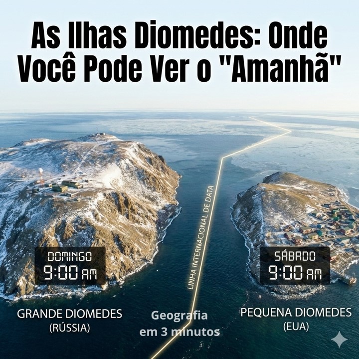 Já pensou em dar um "tchauzinho" para o amanhã? 👋⏳ Parece ficção científica, mas é pura geografia! Nas Ilhas Diomedes, situadas no Estreito de Bering, você pode literalmente olhar pela janela e ver o futuro (ou o passado). Apenas 4 quilômetros separam a Grande Diomedes (Rússia) da Pequena Diomedes (EUA). Mas, como a Linha Internacional de Data passa exatamente entre elas, a diferença de fuso horário chega a 21 horas! 🤯 Ilha do Amanhã: Grande Diomedes 🇷🇺 Ilha do Ontem: Pequena Diomedes 🇺🇸 Imagine só: você está tomando o seu café da manhã de sábado e, logo ali na frente, seus vizinhos já estão terminando o jantar de domingo. É a viagem no tempo mais curta do mundo! Agora me diz aqui nos comentários: Se você pudesse escolher, preferiria viver na "Ilha do Ontem" para ganhar mais tempo ou na "Ilha do Amanhã" para saber tudo primeiro?